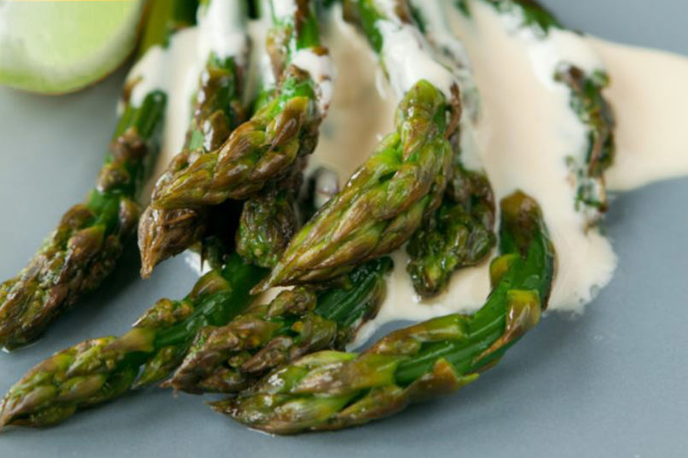 This healthy and flavorful sauce with lime, garlic and sesame paste pairs beautifully with asparagus.