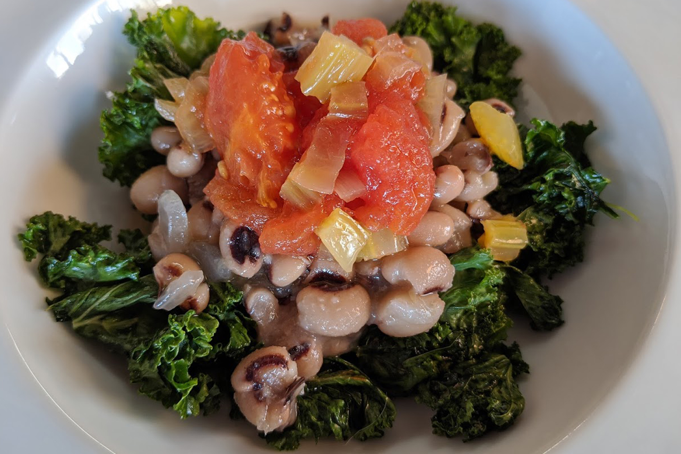 Lucky Black-Eyed Peas, Stewed Tomatoes and Greens